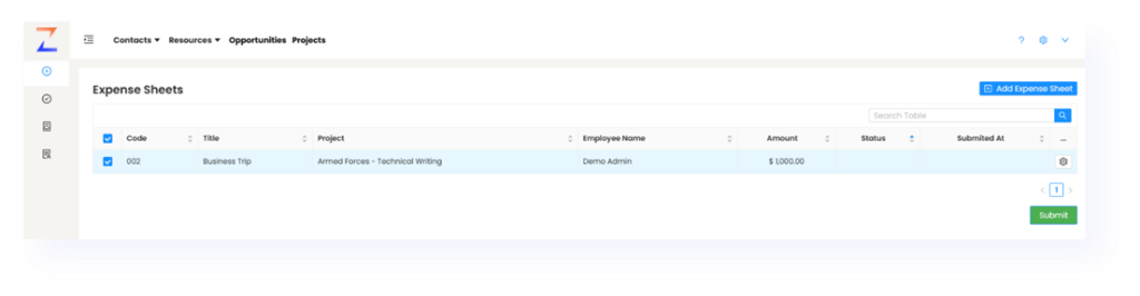 Tick the relevant Expense Sheets you wish to submit. Click the Submit button to send the Expense Sheet for approval.